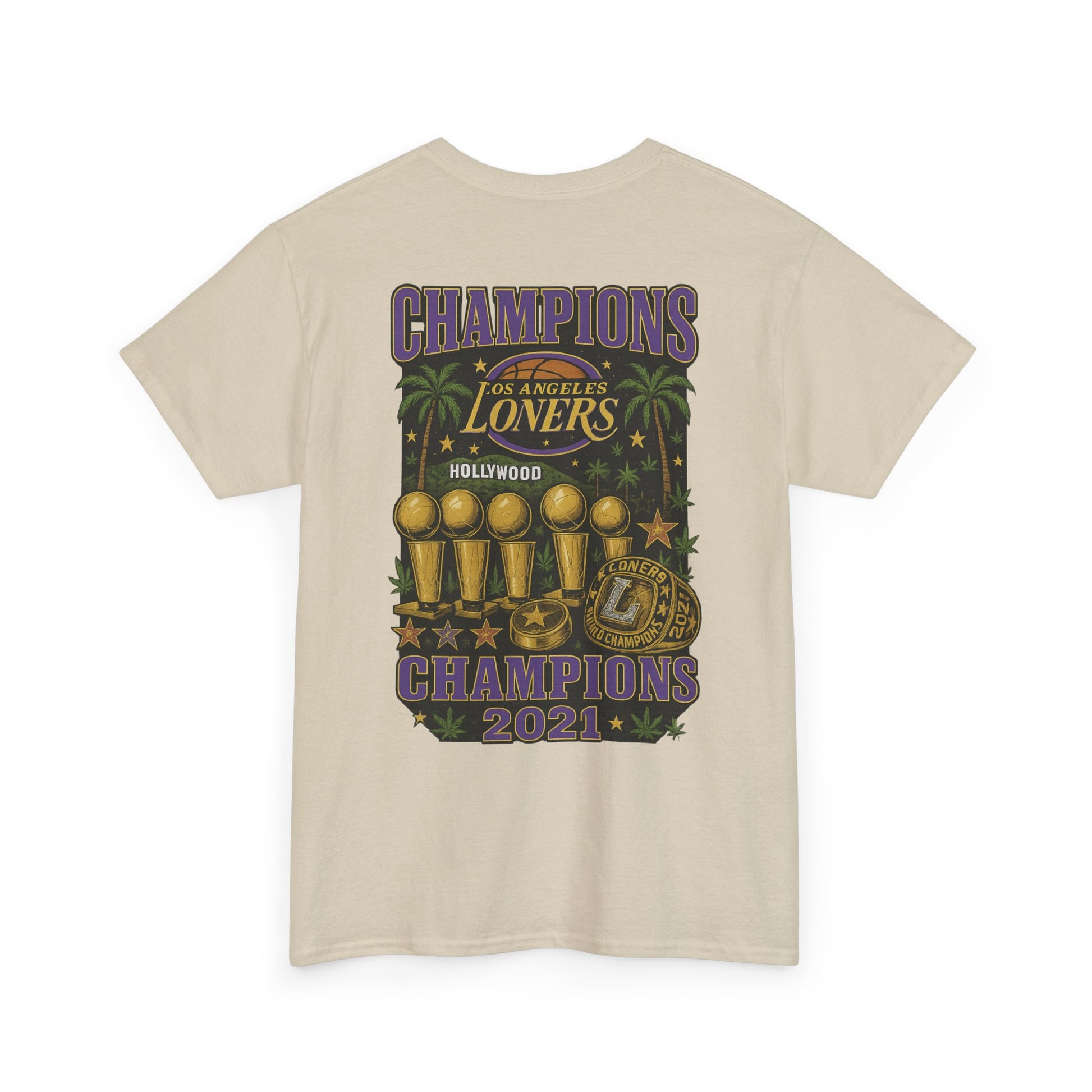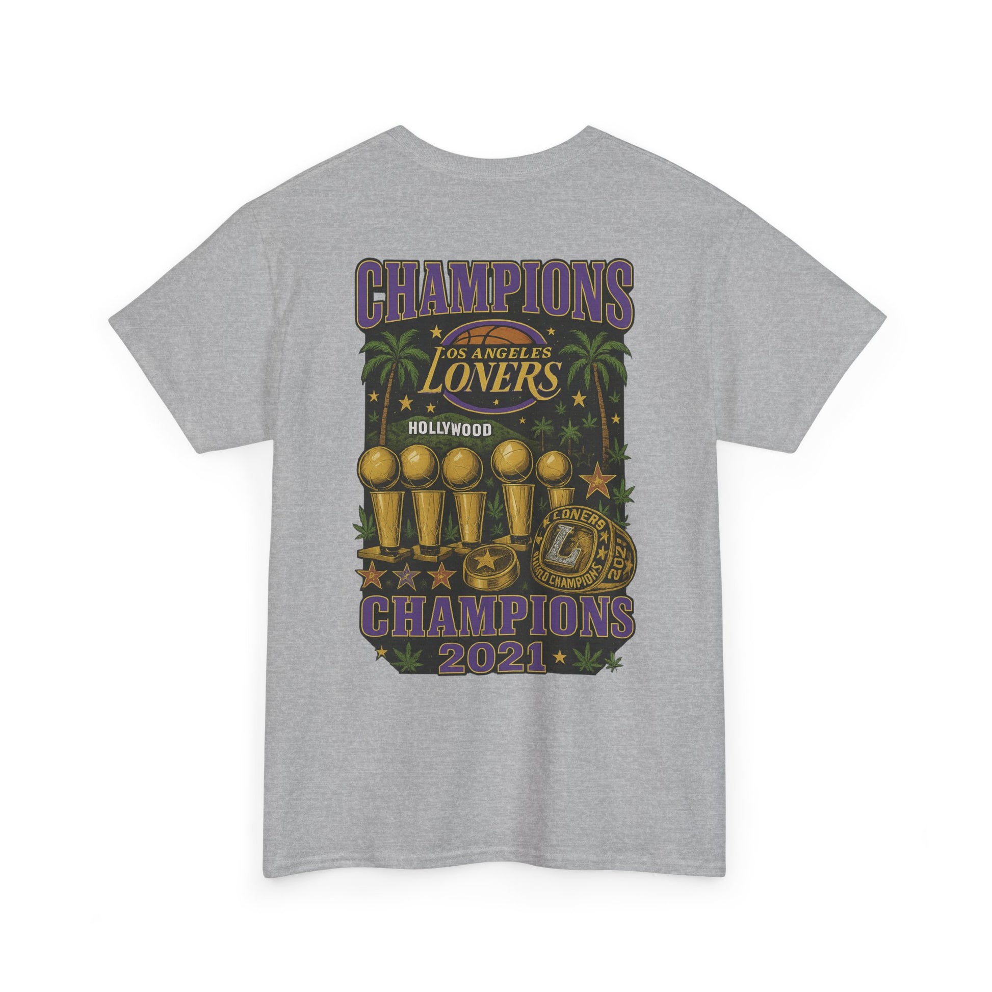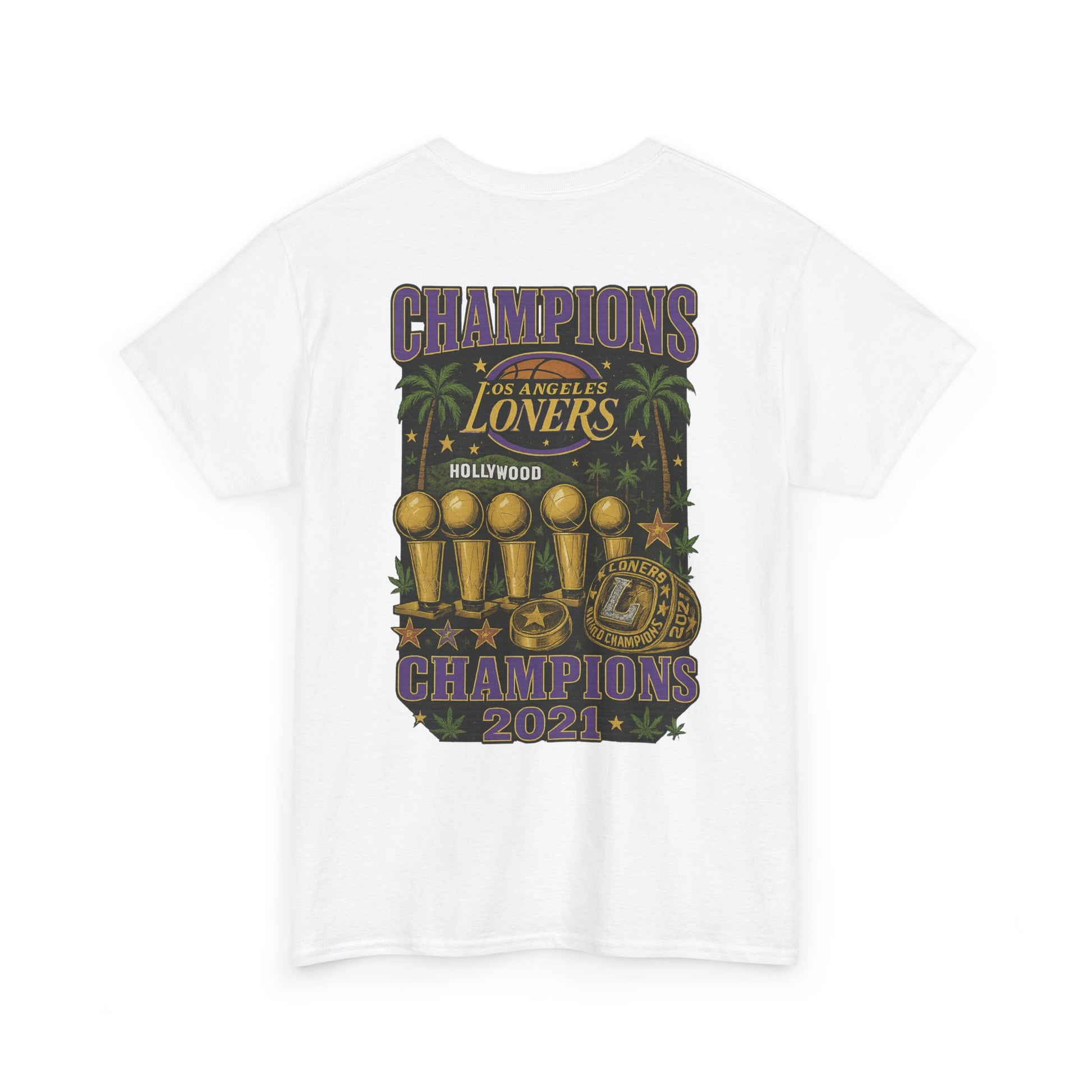 A laid-back, vintage-inspired tee made for people who celebrate their solo streak with a wink. The front wears a retro basketball emblem that reads “Los Angeles Loners” — a playful nod to nights spent courtside inside your own head. The back unfolds into a trophy-lined, palm-tree poster that declares “Champions 2021,” mixing classic sports iconography with a slightly tongue-in-cheek hometown pride. Lightweight but durable, the shirt holds printed details sharply and sits comfortably with a classic crew neckline and relaxed fit. Wear it to low-key hangouts, late-night drives along palm-lined streets, or whenever you want to show off a proud, private kind of swagger.